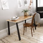 Smukłe krawędzie, złamane kątami o różnej szerokości tworzą otwartą formę, nieznacznie odchyloną od pionu. Meble oparte na tej konstrukcji dodają wnętrzu nietuzinkowego wyrazu, subtelnie i z przymrużeniem oka, traktując geometrię. Doskonale sprawdzą się w każdym rozmiarze, najlepiej w zestawach jako stylowa podstawa pod stół czy praktyczne biurko, konsekwentnie uzupełniając aranżację wielu pomieszczeń w domu. Szczególnie efektownie wygląda w połączeniu z cienkim blatem lub szklaną taflą odsłaniającą w pełni nieregularny kształt.